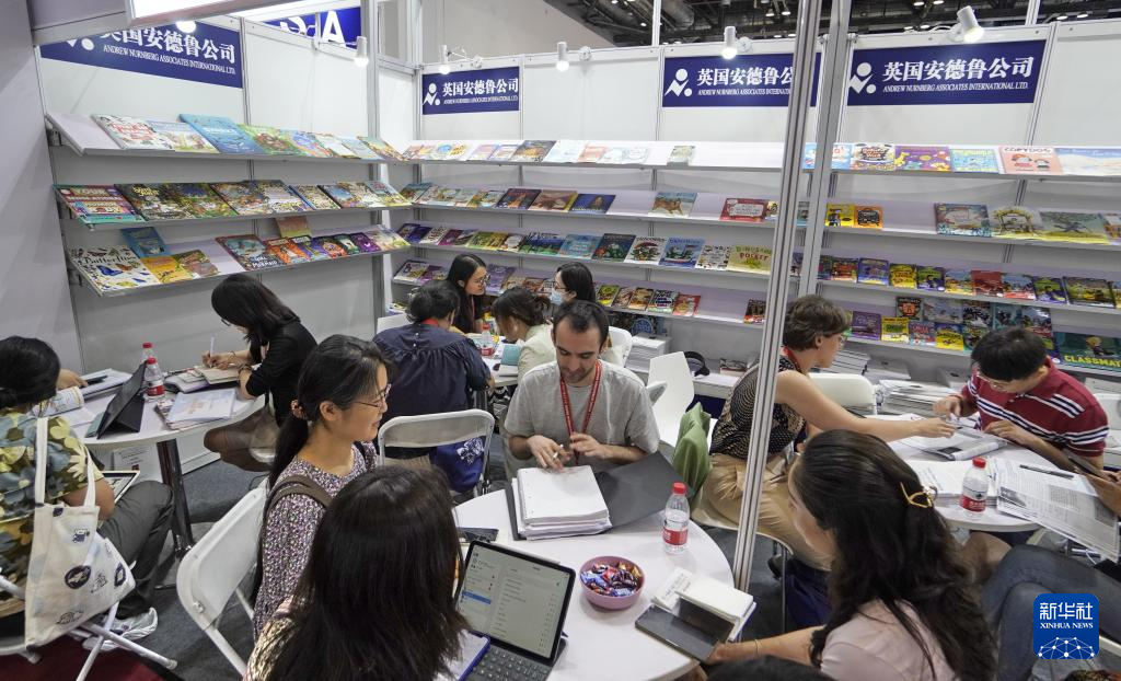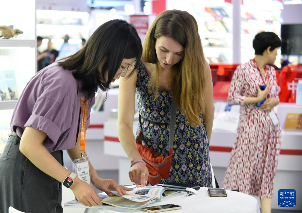 6月19日,在北京展区,海豚出版社的工作人员与来自俄罗斯的客人商洽图书版权。