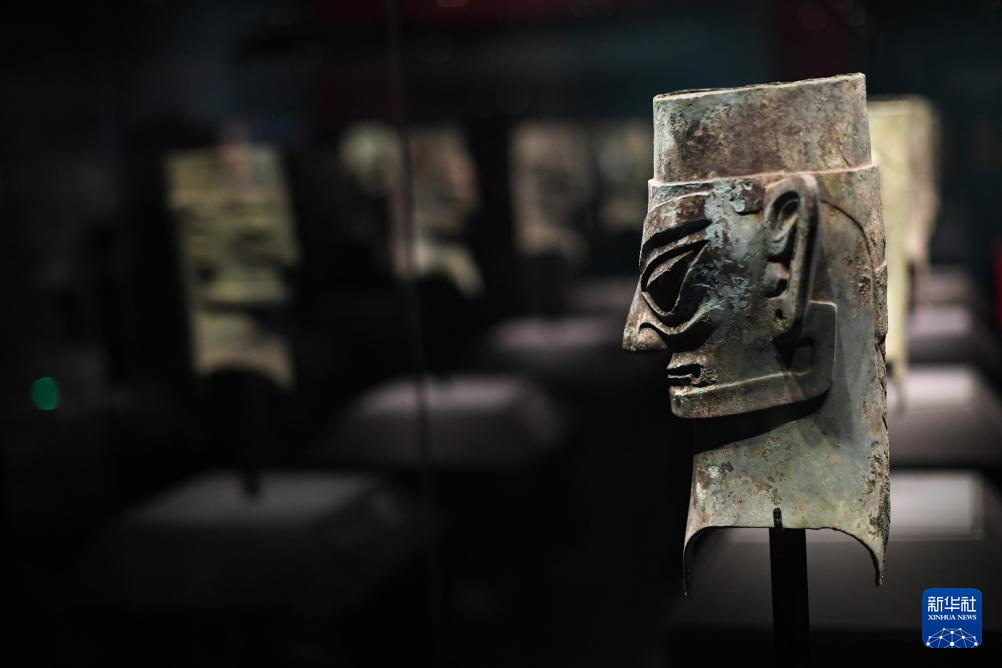6月27日拍摄的戴金面罩青铜人头像。