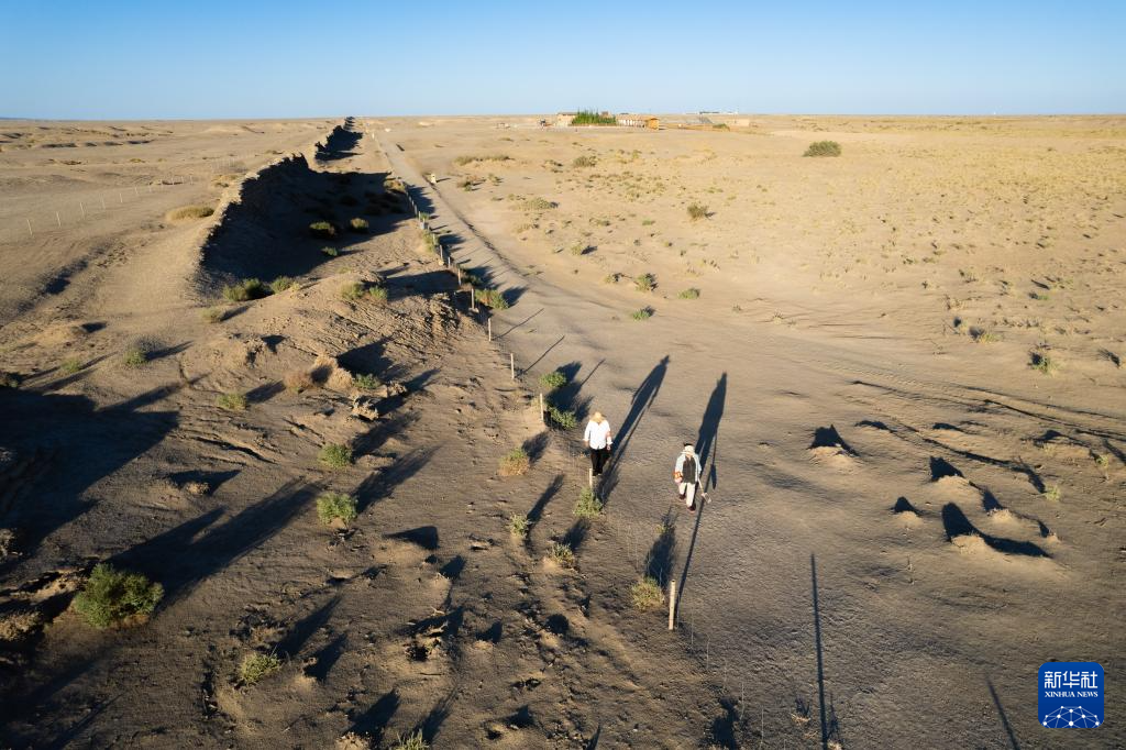 7月16日,张吉全和闻春瑜夫妇沿着汉长城巡护(无人机照片)。