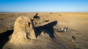 7月16日,张吉全和闻春瑜夫妇沿着汉长城巡护当谷燧(无人机照片)。