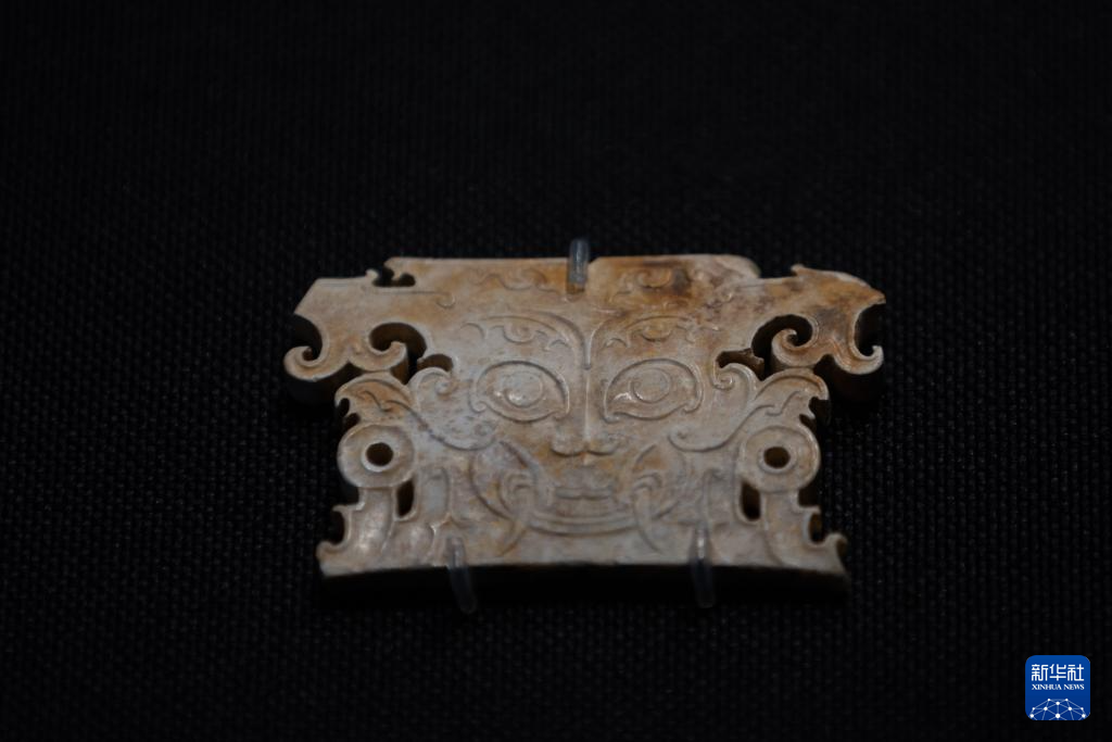 这是7月28日在重庆中国三峡博物馆举行的“玉出大江——长江流域史前玉器特展”上拍摄的肖家屋脊文化獠牙神面玉牌饰。