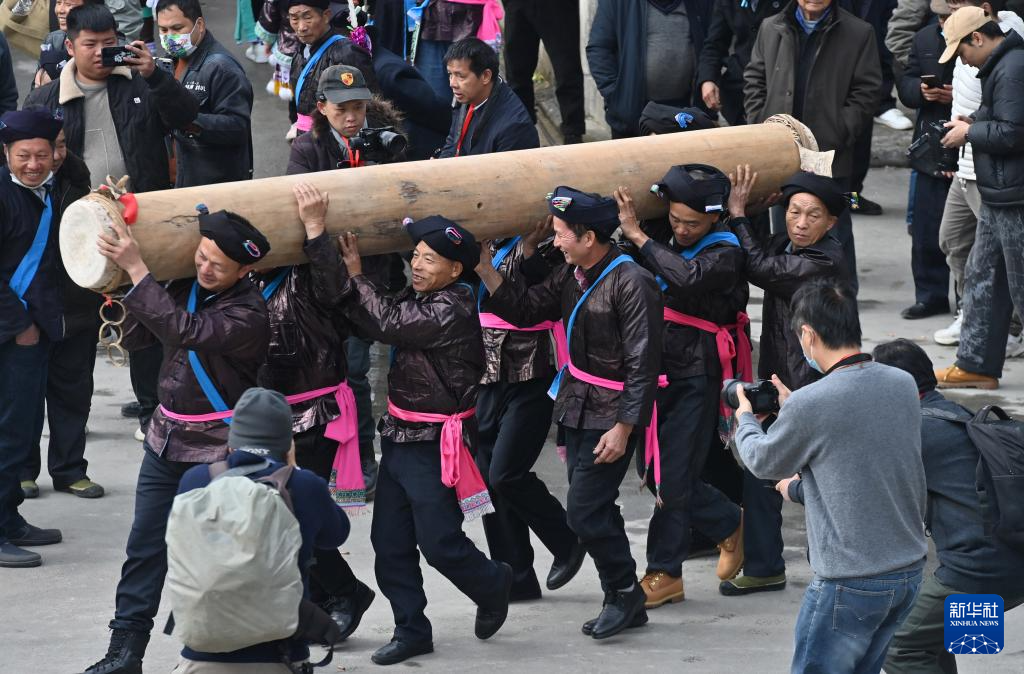 在融水苗族自治县杆洞乡尧告村,村民们在拉鼓祈福(无人机照片,2022年12月7日摄)。