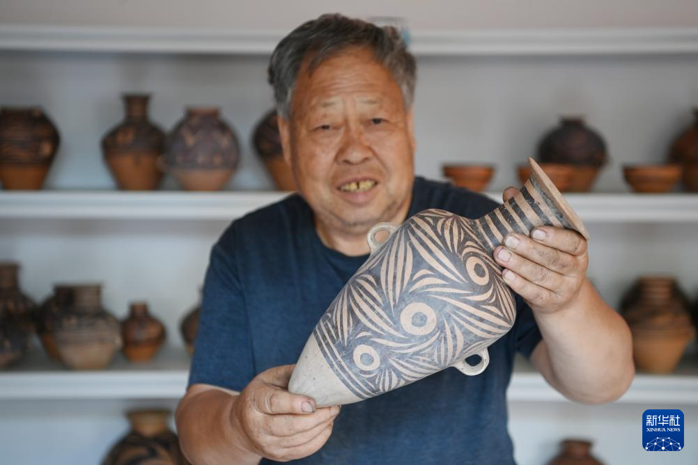 9月3日,阎建林在家中展示自己制作的彩陶工艺品。