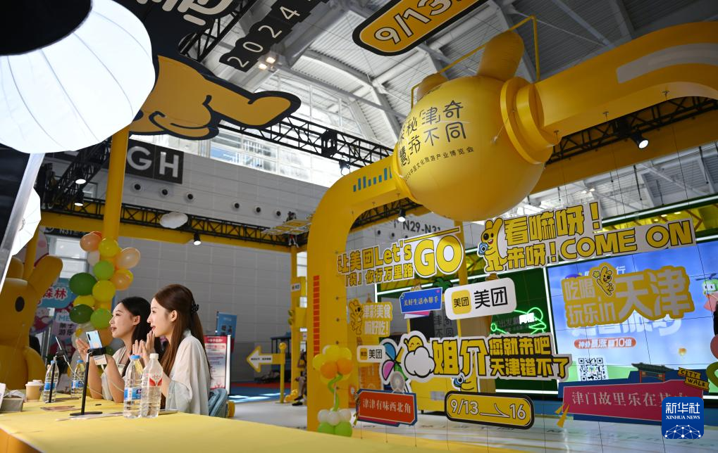 9月13日,在国家会展中心(天津),美团展台工作人员在进行直播。