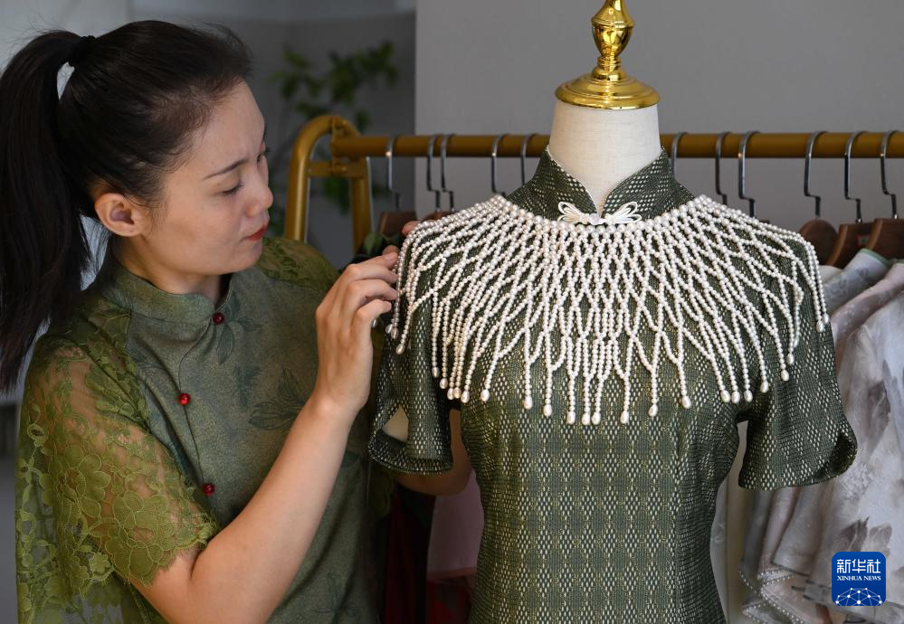 楚蒙丹在位于洛阳市的非遗体验馆里整理珍珠衫与服装的贴合度(9月12日摄)。