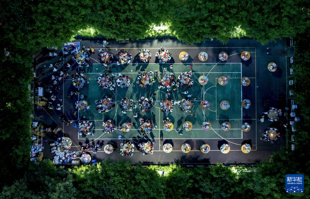 这是9月14日在福建厦门一小区拍摄的“中秋博饼晚会”现场(无人机照片)。
