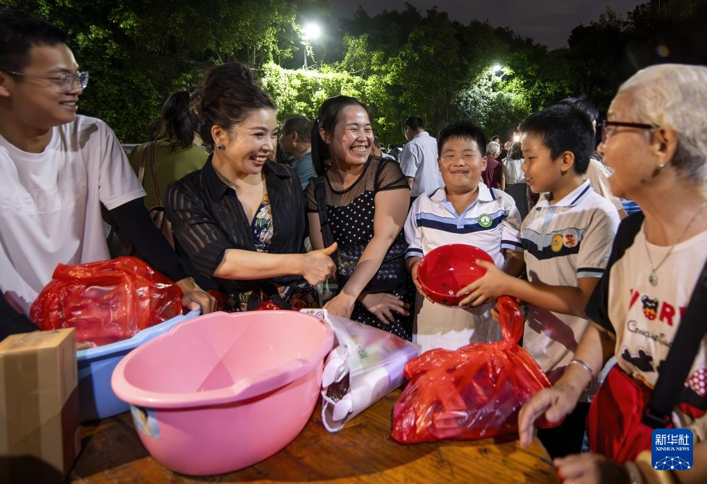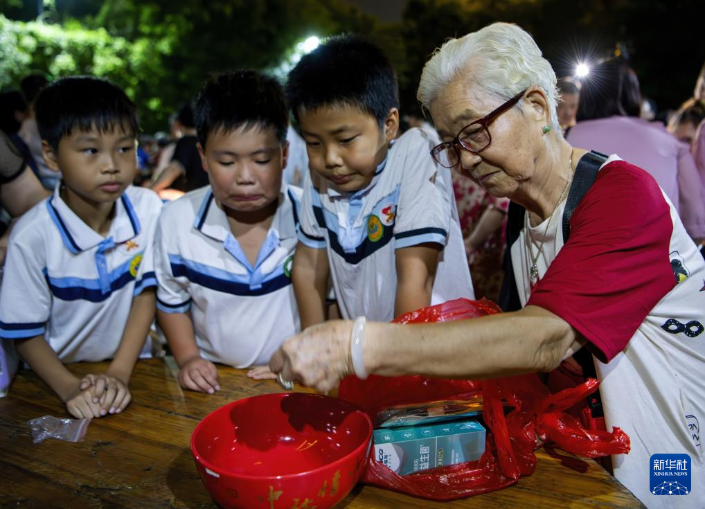 9月14日,在福建厦门一小区内,老少居民一起参加博饼活动。