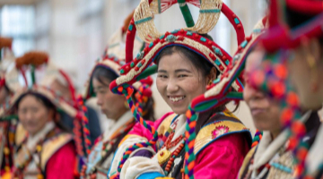 西藏日喀则市定结县,“萨尔谐钦”演职人员在整理头饰(9月25日摄)。