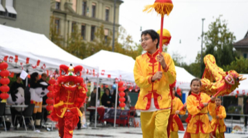 9月27日,在瑞士伯尔尼“遇见中国”文化节上,人们在表演舞龙舞狮。