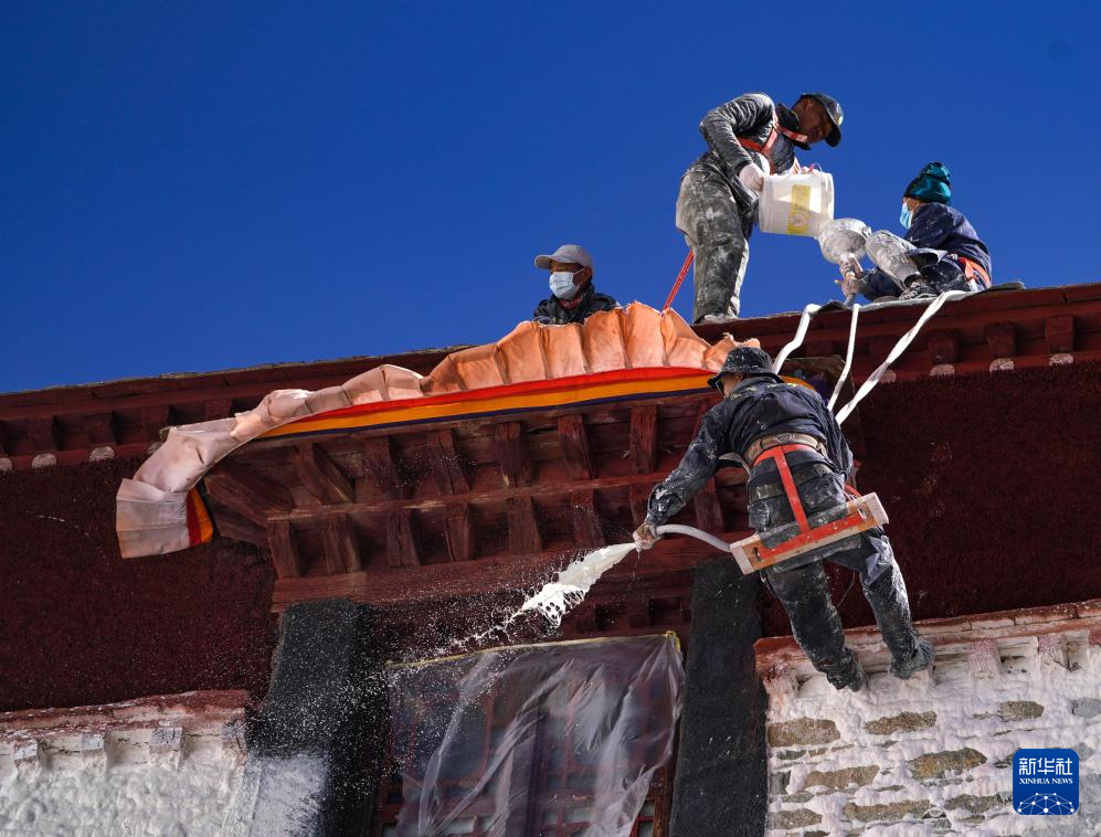 10月30日,布达拉宫管理处的工作人员在喷洒涂料。