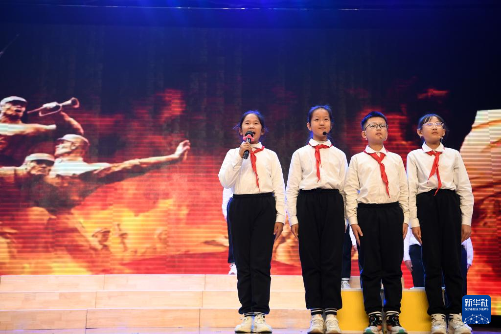 11月13日,在北京市第四中学顺义分校活动现场的思政课上,顺义区龙湾屯中心小学校的学生表演情景剧《红色少年成长记》。