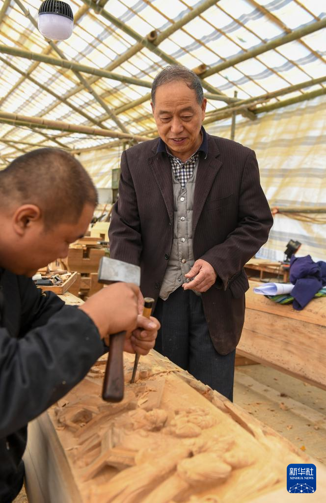 11月22日,在浙江临海汇溪镇浚头村,黄大树指导当地工匠雕刻梁上的故事画。