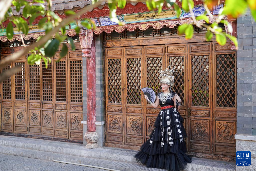 12月8日,游客在官渡古镇“古渡梨园”体验滇剧表演。