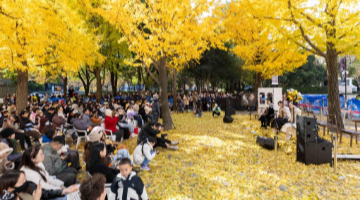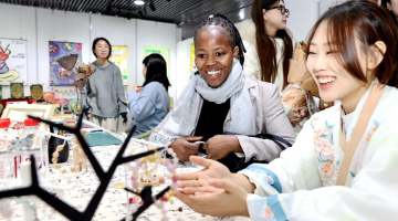 12月9日,庄恩琪在路边与巡游中的贵屿镇后望村英歌队互动。