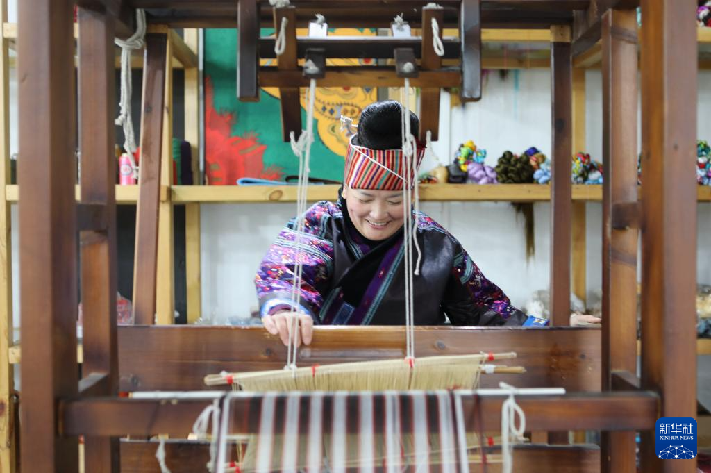 12月10日,在贵州省黔东南苗族侗族自治州施秉县特色民族刺绣产业园一家苗绣企业生产车间,技术人员在制作苗绣样品。