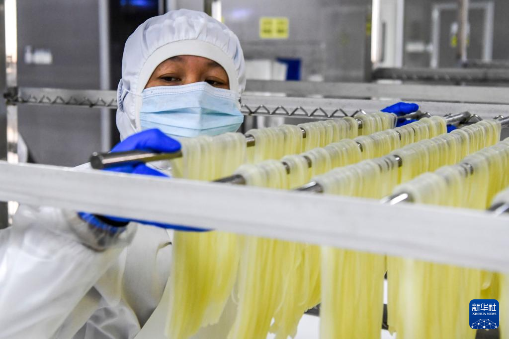 12月13日,在柳州市一家螺蛳粉生产企业,工作人员将刚刚生产出来的米粉悬挂在架子上。