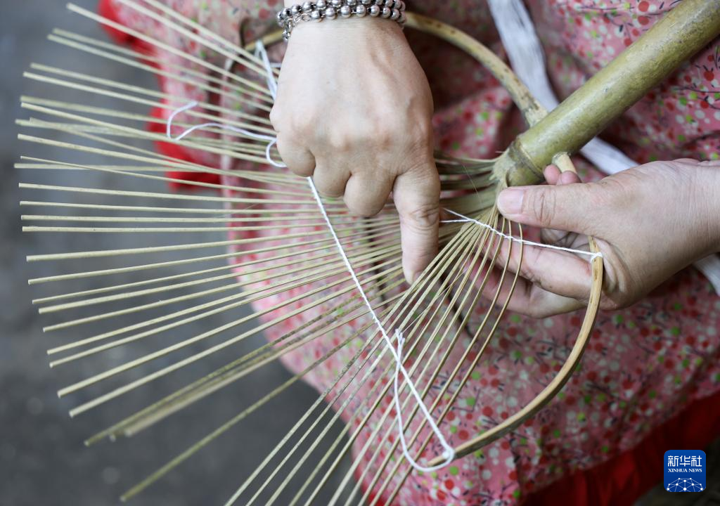 在宁德福安市官埔村,一家官埔油扇作坊的工人在编制油扇扇面(2024年6月25日摄)。