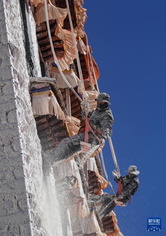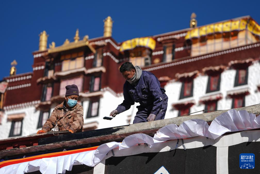 布达拉宫管理处维修科工作人员在喷洒涂料(10月30日摄)。