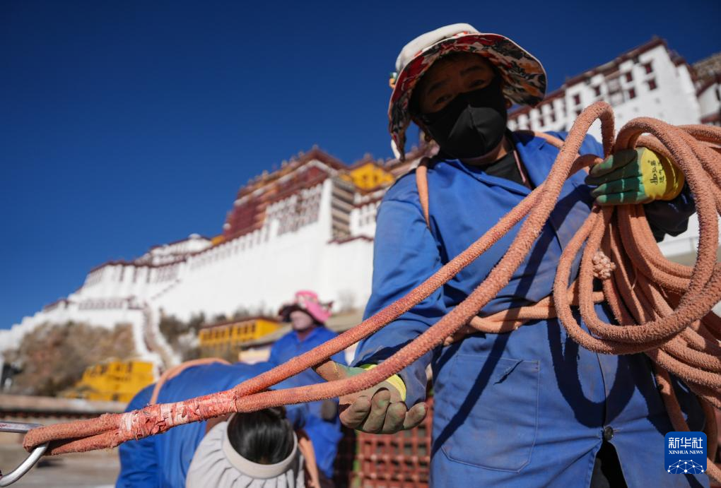 布达拉宫管理处维修科工作人员在整理安全绳,准备粉刷墙体(12月4日摄)。