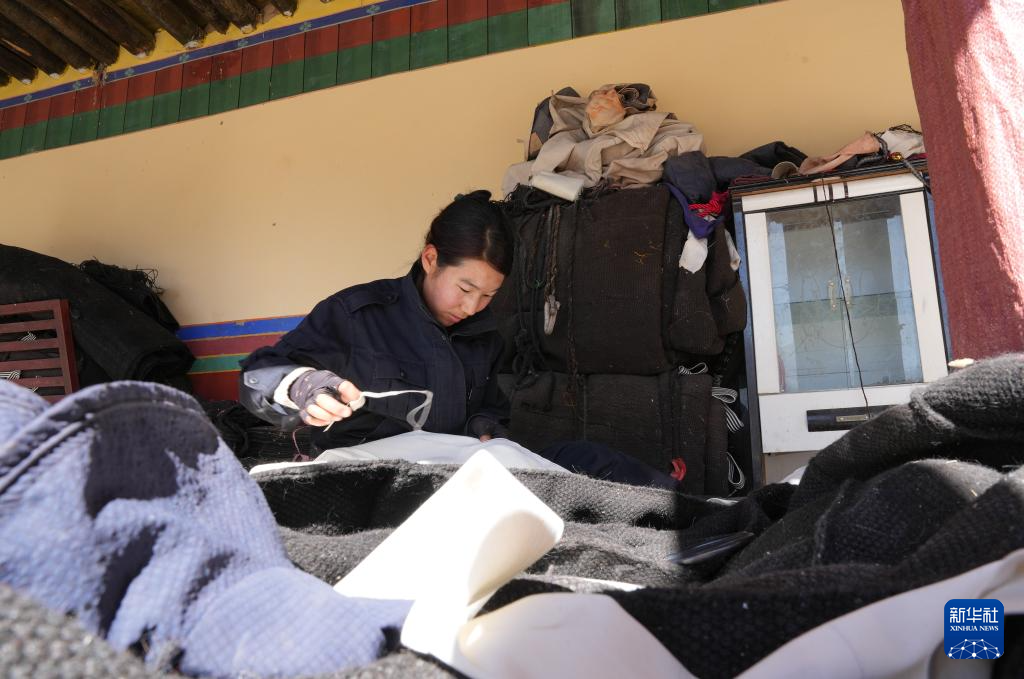 布达拉宫管理处维修科工作人员旦增卓玛在缝制门帘(12月4日摄)。