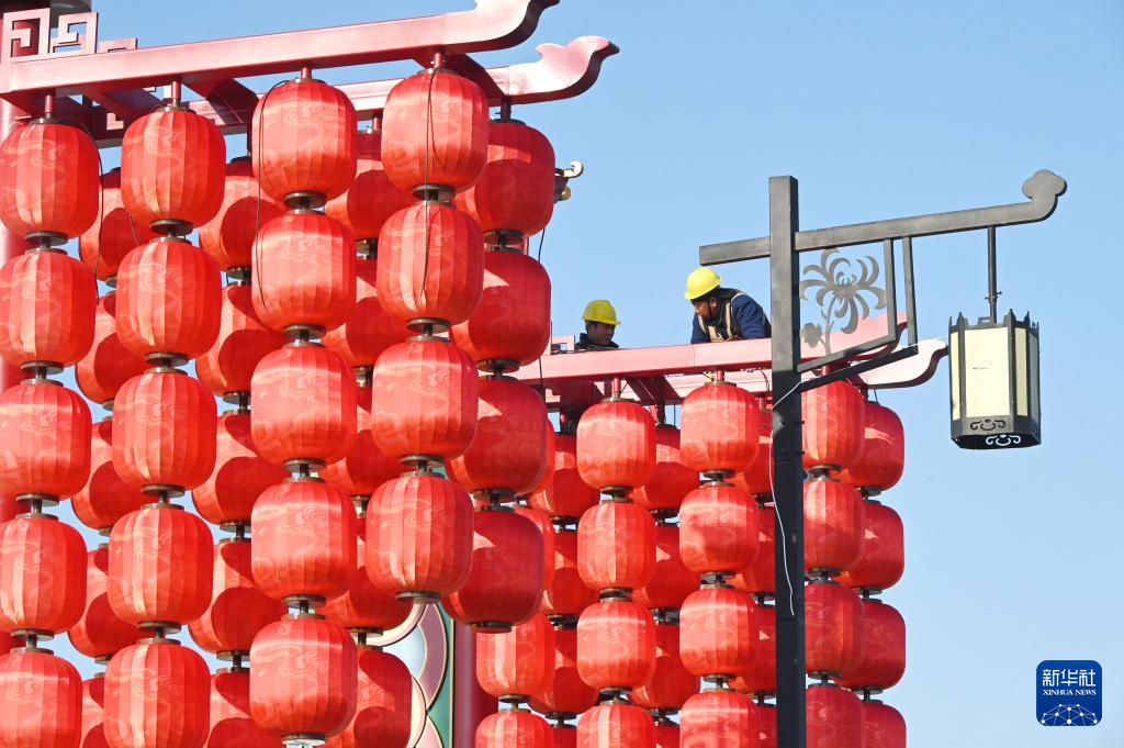 1月19日,河南省开封市龙亭湖风景区工人在悬挂红灯笼。