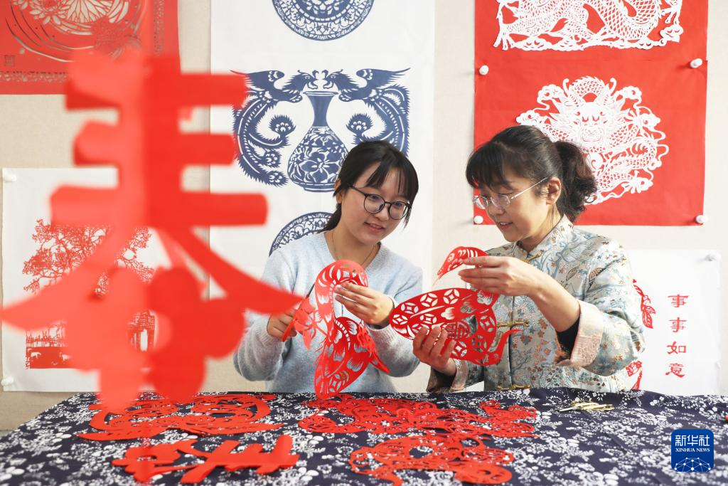 1月22日,在河北省唐山市丰润区太平路街道冀新社区,剪纸艺人葛英(左)在教居民创作生肖蛇剪纸作品。
