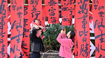 1月26日,在广东汕头金平区绿梦生态园,游客竞相与英歌队员合影。