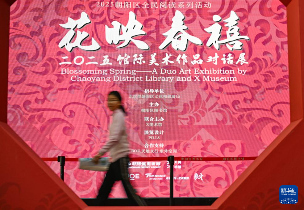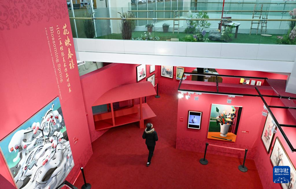 2月9日拍摄的在朝阳区图书馆劲松馆举办的“花映春禧”二〇二五馆际美术作品对话展。