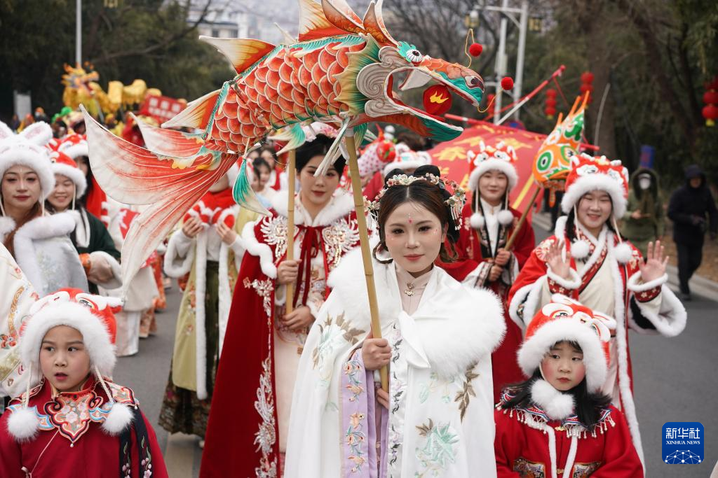 2月11日,展演队伍在盱眙县城市道路上巡游。