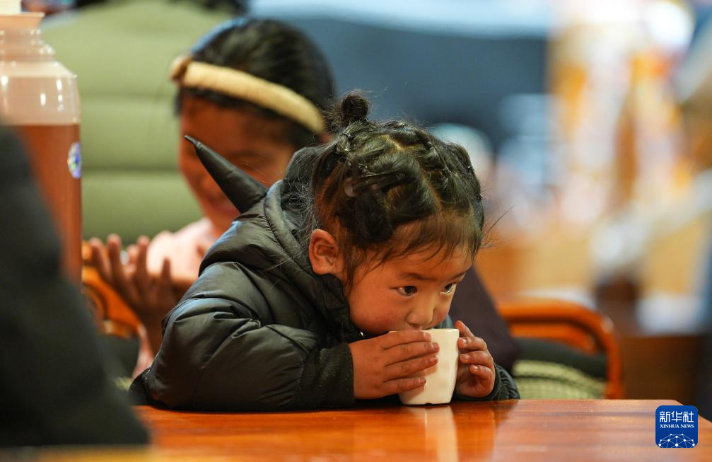 小顾客在“牧人宝库”藏式茶馆喝酥油茶(2月13日摄)。