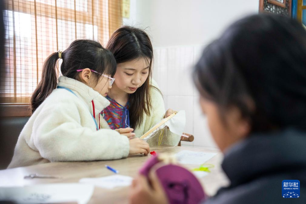 3月6日,在桃源县寺坪中学,学生在练习桃源刺绣。
