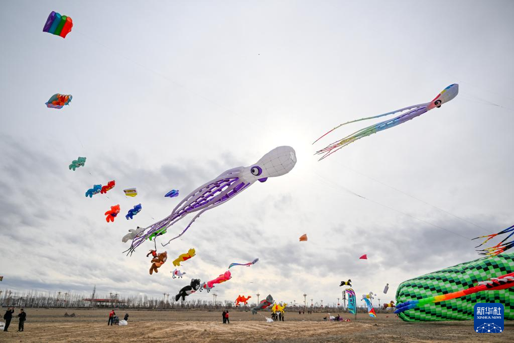 这是3月8日在新疆都拉塔口岸房车露营基地拍摄的风筝表演。