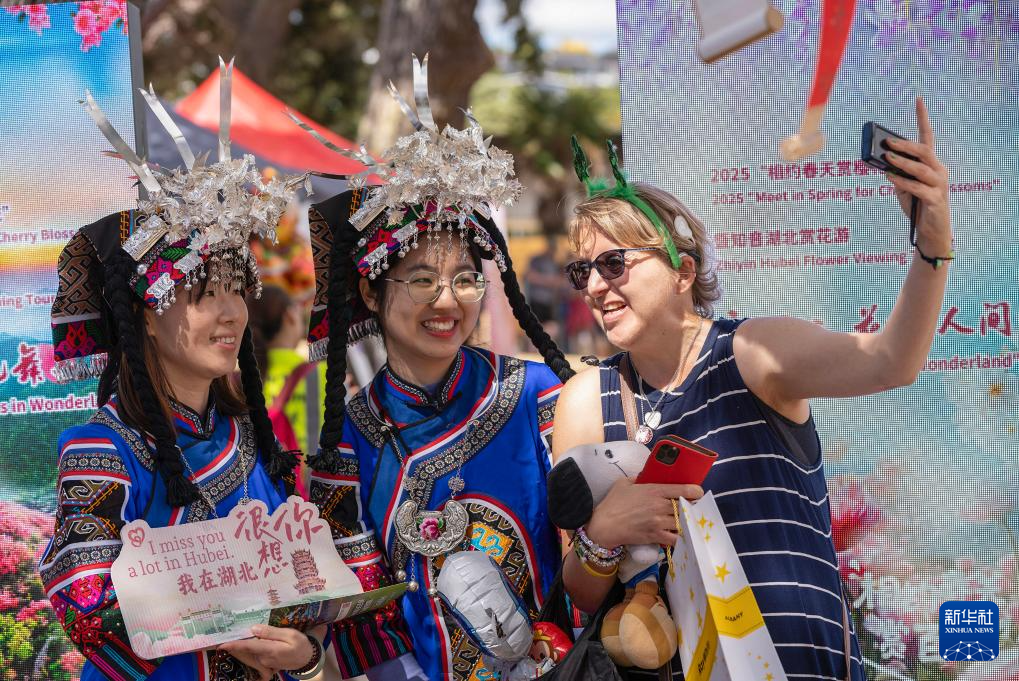 3月16日,在新西兰奥克兰举行的新西兰中国儿童文化日活动上,一名游客与身穿中国少数民族传统服饰的工作人员合影。