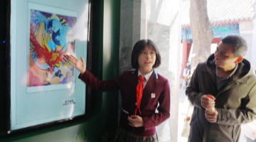 3月25日,一名记者在北京中国国家博物馆展出的明孝端皇后九龙九凤冠旁展示凤冠冰箱贴。