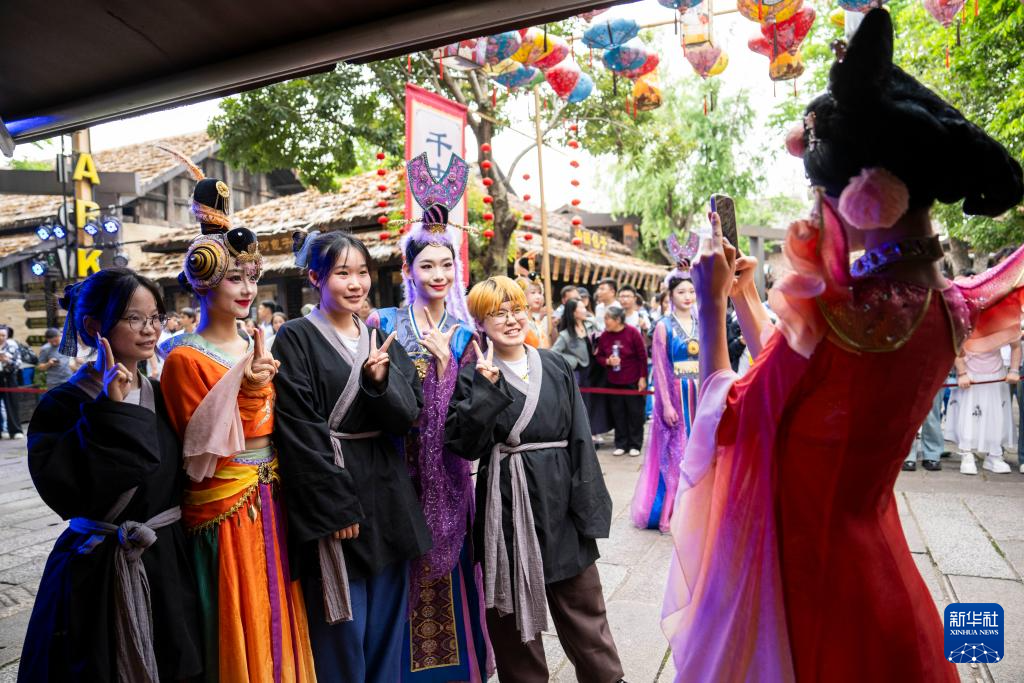 4月28日,在宁乡市炭河古城景区,学生与游客合影。