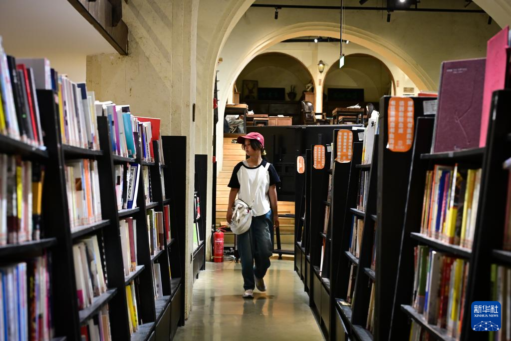 5月25日,青海省西宁市几何书店内,一名市民走过书架。