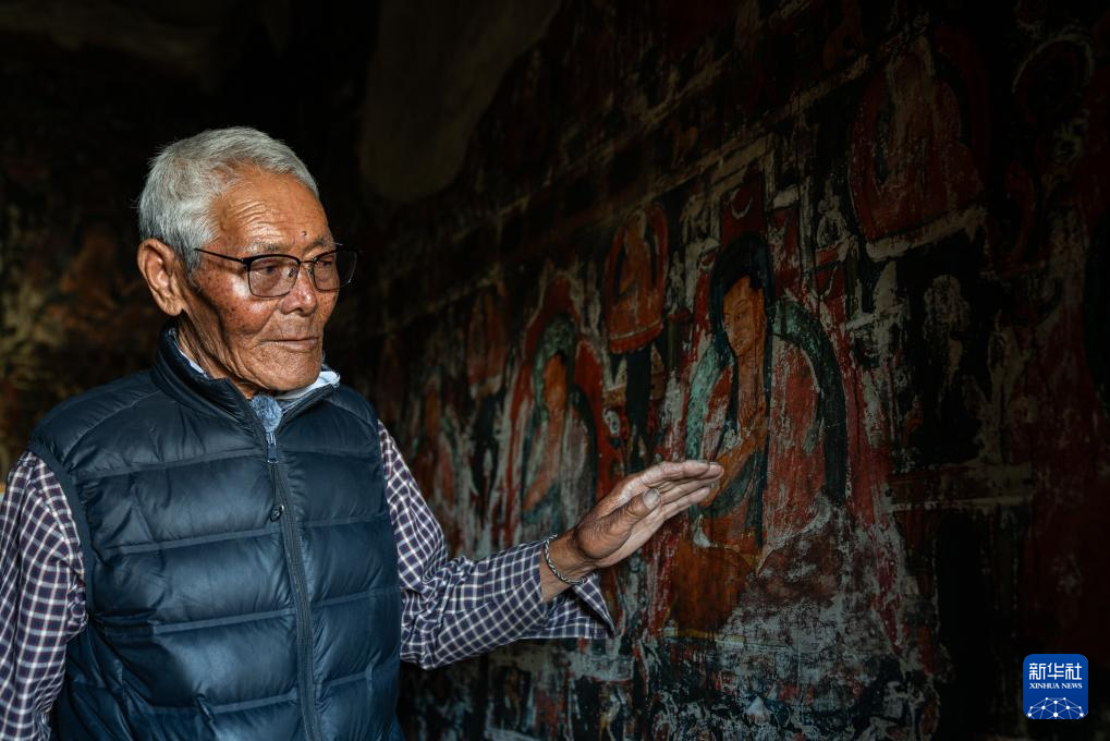 早上十点,仁增旺扎会从家出发,顺着400多级陡峭的台阶,几步一歇地爬上石窟。抵达后,他会先把石窟打扫干净,然后爬上爬下,重点检查几处有壁画的石窟内是否有渗水、坍塌等风险。有游客来参观时,他会给游客讲解石窟及壁画的悠久历史,也会提醒他们要注意保护壁画;送走游客,他总会细心关好每一扇石窟的门。忙碌间隙,他习惯坐在石窟前,喝点自带的酥油茶,嚼几口糌粑——这便是仁增旺扎二十余年如一日的守窟日常。
