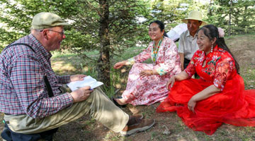 6月28日,“黄河大集”田园丰收市集的一位摊主在整理花馍。