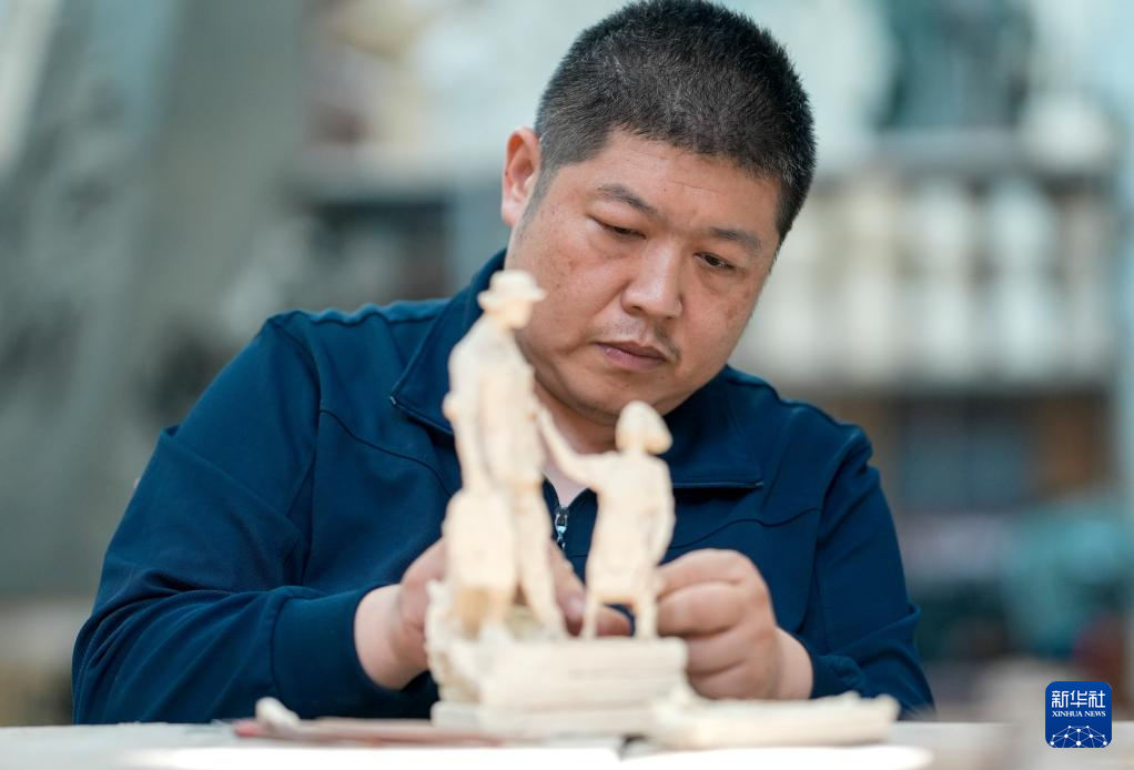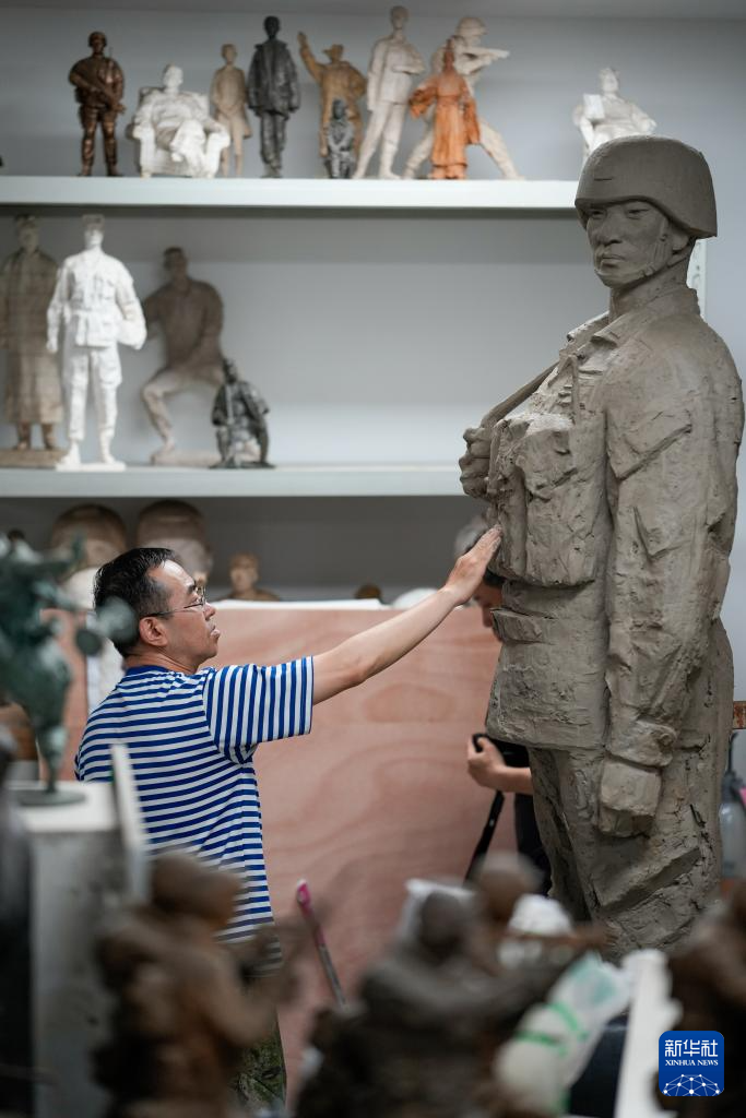 7月24日,国防大学军事文化学院副教授王树山在查看自己的雕塑作品。