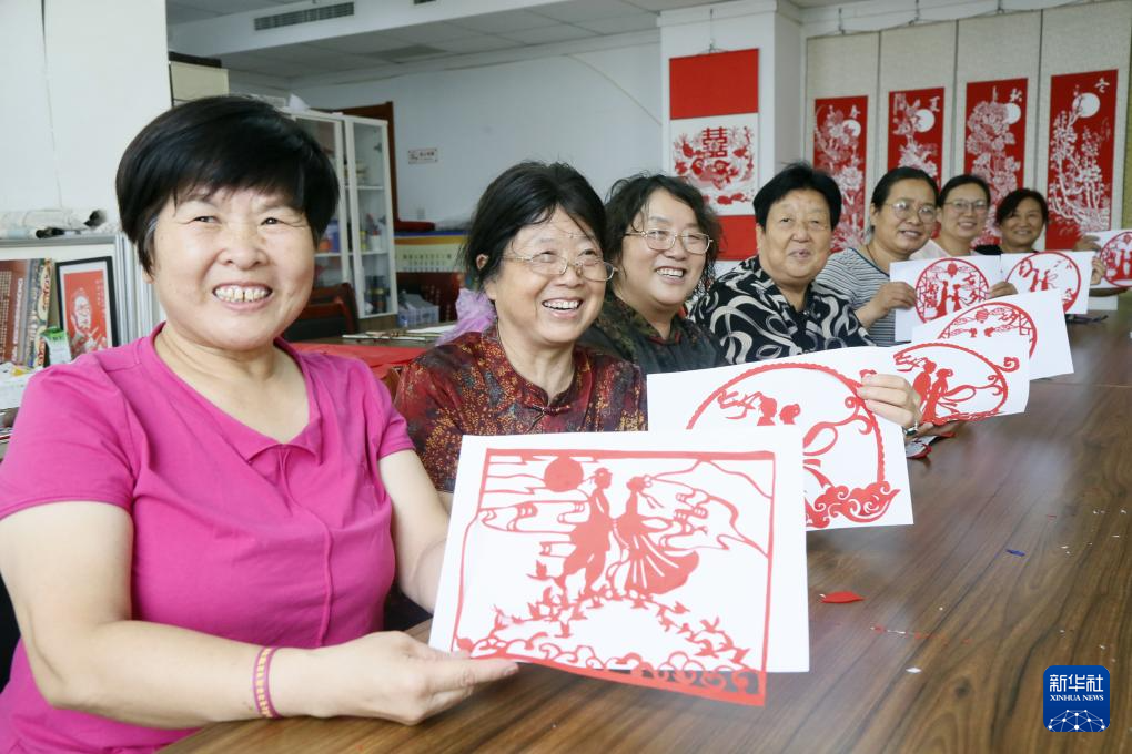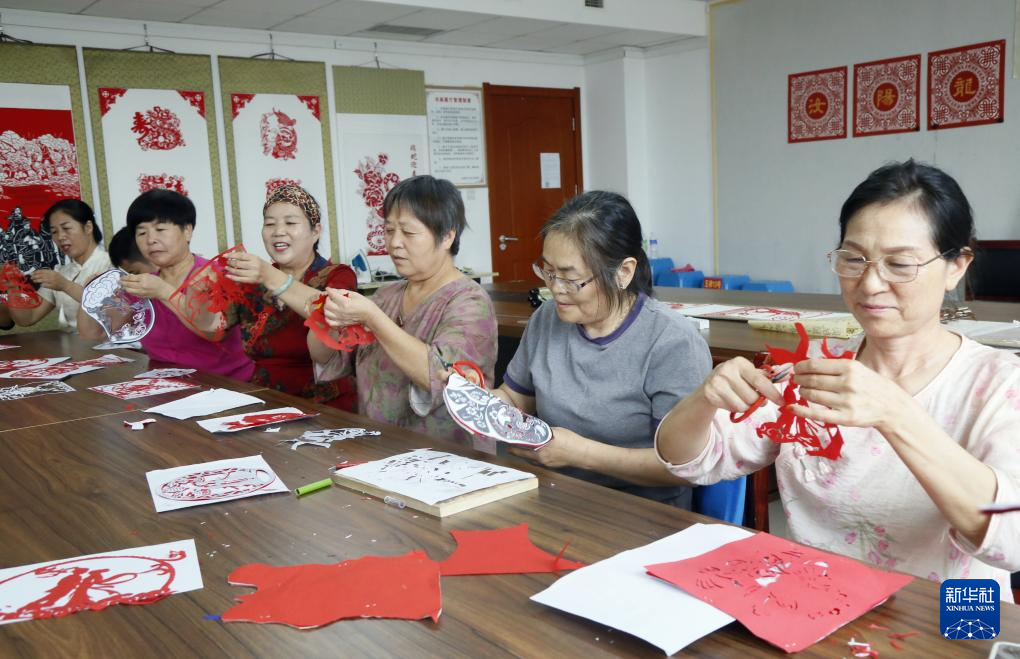 8月26日,在河南省洛阳市汝阳县人民文化馆,剪纸艺人创作七夕主题剪纸作品。