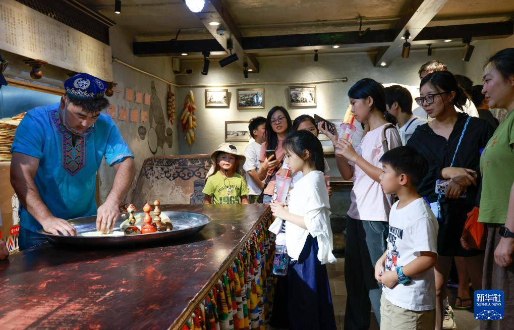 7月23日,在位于乌鲁木齐的大巴扎馕主题馆,工作人员为游客展示打馕技巧。