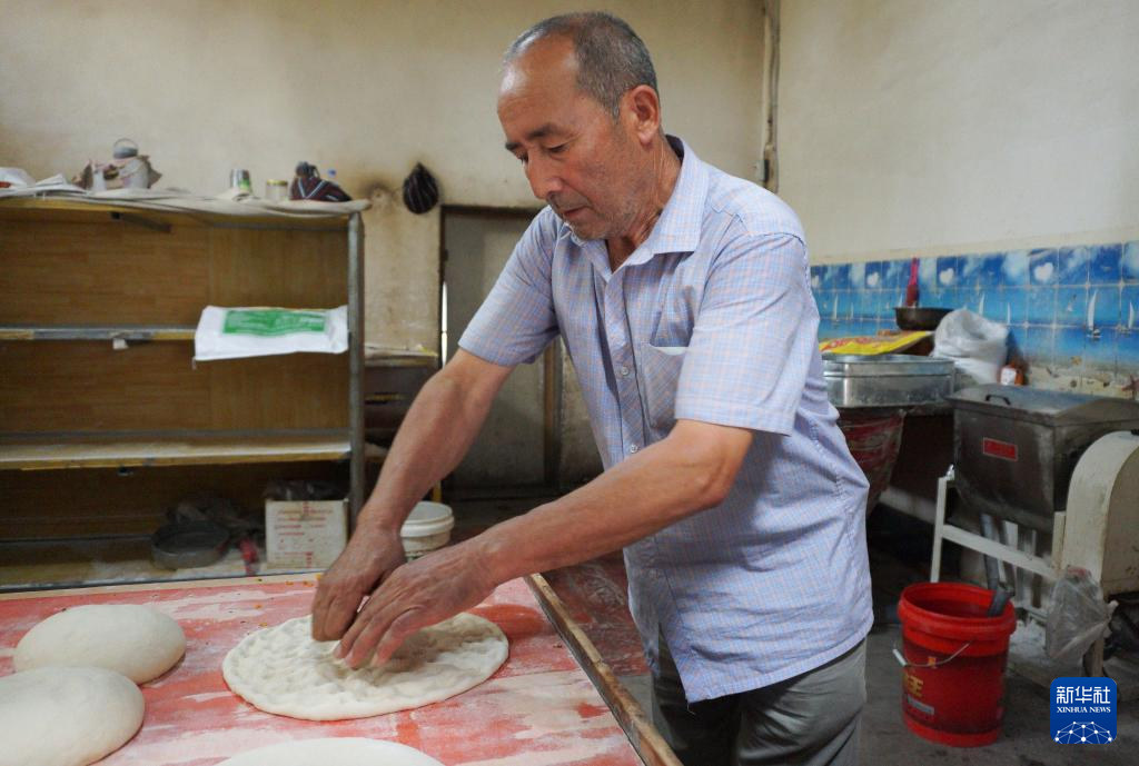 7月22日,在新疆库车市,热西提在自家馕店中打馕。