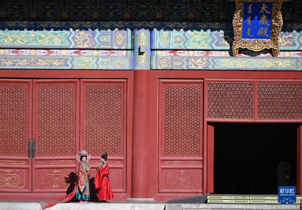 12月30日,身着传统服饰的游客在先农坛内坛区域的太岁殿前留影。