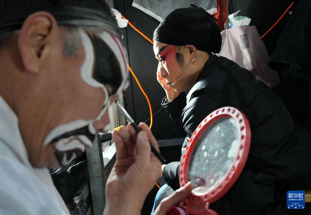 1月29日,在丽水市缙云县七里乡梅下村,建德市婺剧团的演员们在送戏下乡演出前热身。