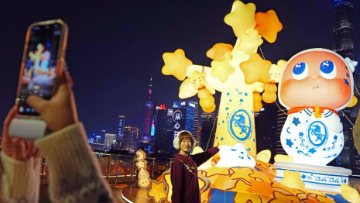 2月4日,“春姑娘”“牛童”和嘉宾向市民抛掷福袋。