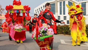 2月4日,“春姑娘”“牛童”手持花枝鞭打春牛。