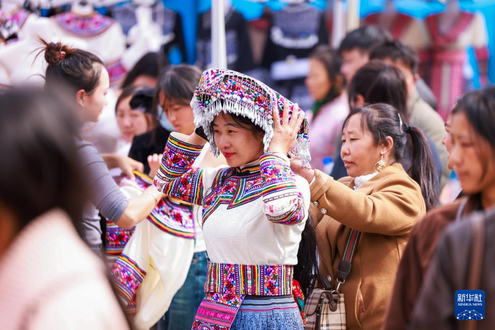 2月10日,在云南省红河哈尼族彝族自治州开远市的苗族大集上,少数民族群众在集市上试穿新衣。