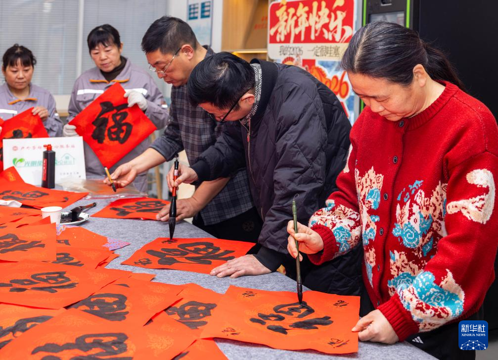 2月10日,在江苏省泰州市海陵区光明使者爱心驿站,书法爱好者为一线劳动者写“福”字。
