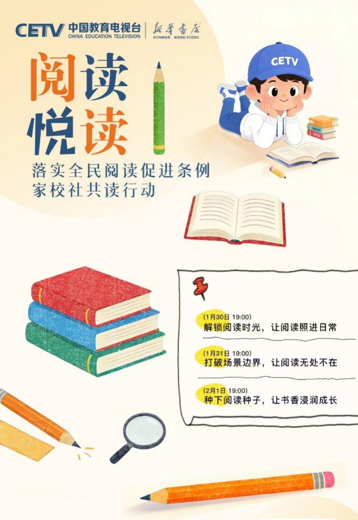 为推动条例有效落地、培养广大青少年更好地阅读,在教育部基础教育司指导下,中国教育电视台联合人民教育出版社、新华书店总店,特邀阅读推广人、阅读领诵人、阅读分享人等,共同开启“落实全民阅读促进条例 家校社共读行动”全媒体直播活动。