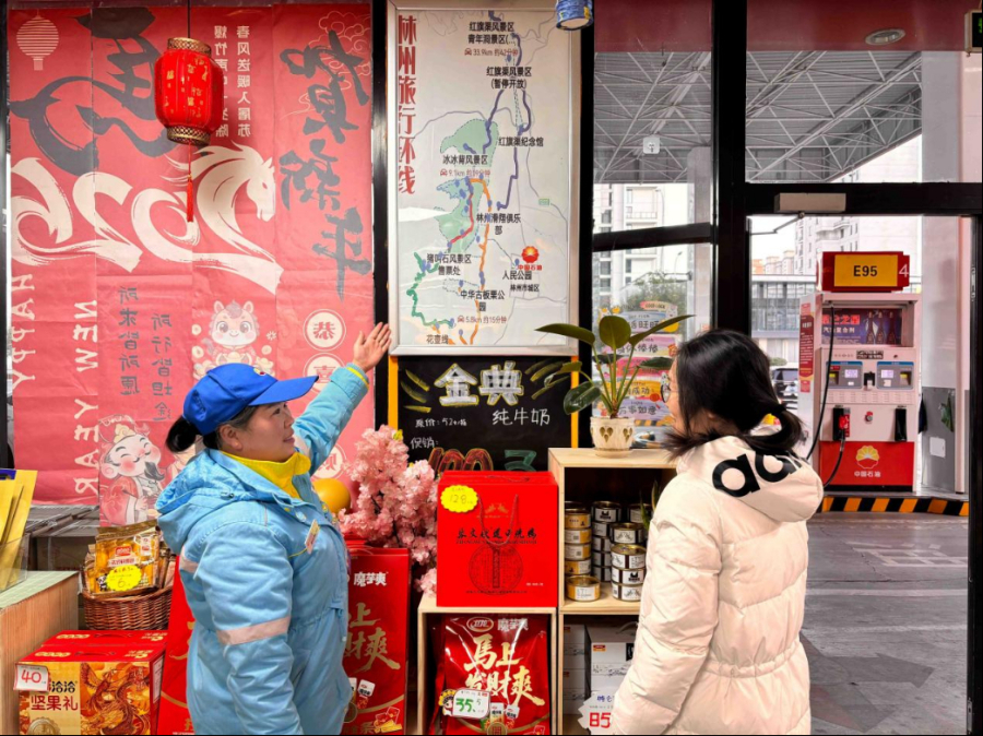 图为在便利店年货专区,加油站员工热情为顾客挑选心仪的节日商品。